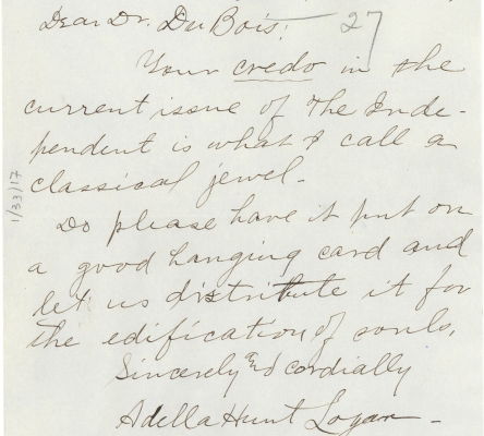 After accepting a teaching position at the Tuskegee Institute in 1883, Adella Hunt Logan forged enduring relationships with fellow educators and civil rights leaders. Among her new acquaintances was NAACP cofounder W. E. B. Du Bois, with whom she shared a lifelong correspondence.